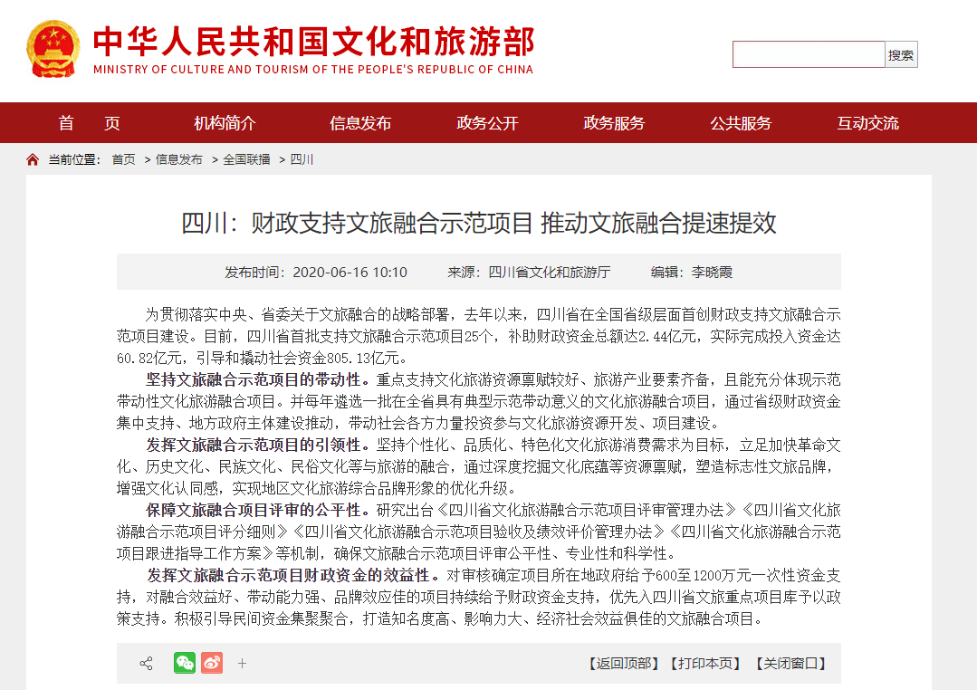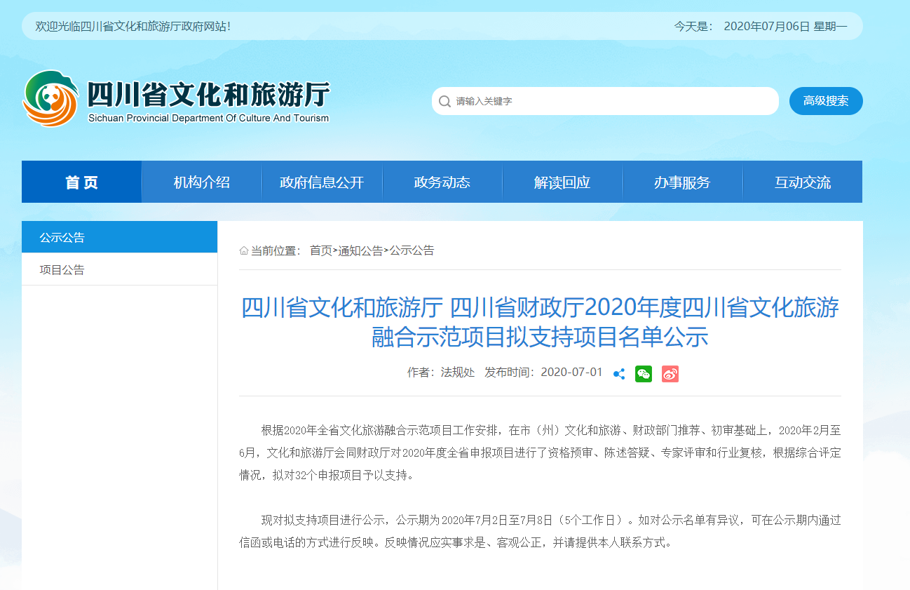 2020年7月1日,四川省文化和旅游廳正式發(fā)布了關(guān)于《四川省文化和旅游廳、四川省財政廳2020年度四川省文化旅游融合示范項目擬支持項目名單公示》。