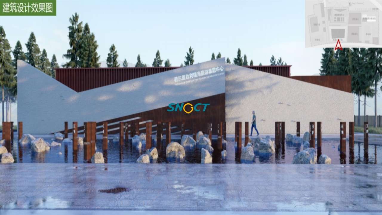 游客服務中心組團設計:“勝利曙光”游客服務中心位于若爾蓋縣城東側,距離縣城約15km,地處通往紅色革命村落門戶位置。服務中心場地基本硬化平整,場地西側有紅色革命雕塑廣場,場地內現(xiàn)設有小車位45個,特產(chǎn)售賣商店等;建筑景觀風貌欠佳,功能較為混亂。計劃在原有舊址基礎上對游客服務中心進行整體化設計,新建游客中心,進行建筑風貌改造。融入紅色文化,融合草原雪山的設計元素,以硬朗的建筑輪廓寓意紅軍過草地的艱苦頑強,亢勇不屈的長征精神。