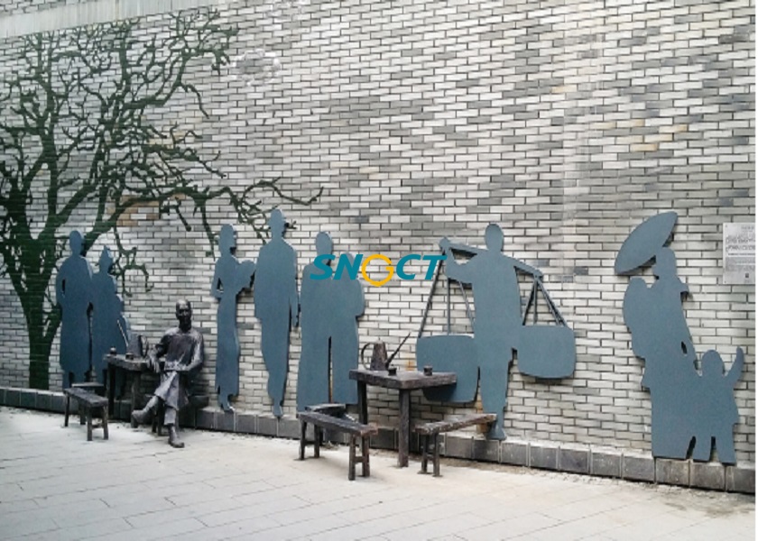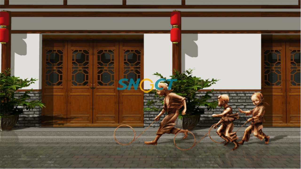 在晟景團隊為內(nèi)江東興老街人文景觀進行提升設(shè)計期間,我們深入探尋甜城內(nèi)江的歷史文化,通過地刻浮雕的形式將制糖的工藝流程展示在地面鋪裝上,另外配上吹糖人的實體雕塑,甜城記憶的主題節(jié)點巧妙地呈現(xiàn)在此。另外,東興老街的市井百態(tài)則通過多組雕塑勾勒再現(xiàn)各年齡階段、各業(yè)態(tài)的市井生活場景,讓游客在此處重拾原汁原味的老街記憶,在東興老街休閑游賞、娛樂、購物消費的同時感受時代趣味和文化氣息。