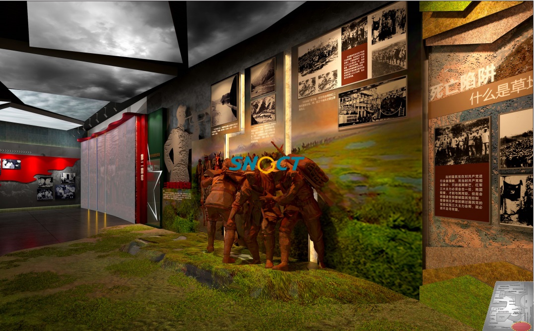 設(shè)計(jì)方案采用了多處場景體驗(yàn)和人物故事還原的展示手段,通過場景復(fù)原來展示若爾蓋段紅軍長征的歷史,讓參觀者能沉浸式的體驗(yàn)到當(dāng)時(shí)環(huán)境惡劣和地方的艱苦;通過人物模型或者二維半的方式來展現(xiàn)若爾蓋段長征途中的重要人物,以及紅軍們戰(zhàn)勝困難留下的事,深刻的刻畫出紅軍長征的精神和斗志。